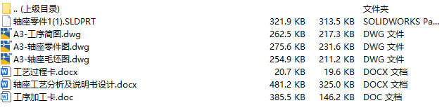 文件内容:solidworks24版三维模型、CAD图纸、工艺卡、工序卡、设计说明书、工序卡用图 轴座solidworks24版三维零件模型 轴座CAD零件图 轴座CAD毛坯图 机械加工工艺卡 机械加工工序卡 轴座设计说明书目录 轴座设计说明书内容