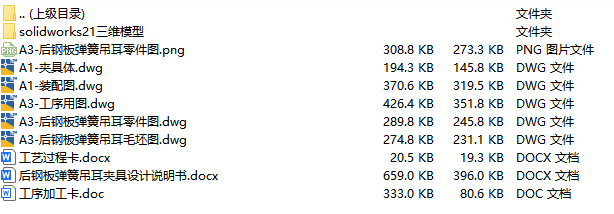 文件内容:solidworks24版三维模型、CAD图纸、工艺卡、工序卡、设计说明书、工序卡用图 solidworks24版本模型源文件,可编辑,含参数 后钢板弹簧吊耳夹具solidworks24版三维装配模型 后钢板弹簧吊耳夹具solidworks24版三维装配模型 后钢板弹簧吊耳夹具CAD装配图 后钢板弹簧吊耳CAD零件图 后钢板弹簧吊耳CAD夹具体 后钢板弹簧吊耳CAD毛坯图 机械加工工艺卡 机械加工工序卡 后钢板弹簧吊耳设计说明书目录 后钢板弹簧吊耳设计说明书内容