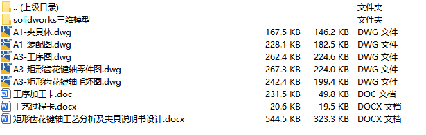 文件内容:solidworks24版三维模型、CAD图纸、工艺卡、工序卡、设计说明书、工序卡用图 solidworks24版本模型源文件,可编辑,含参数 矩形齿花键轴夹具solidworks24版三维装配模型 矩形齿花键轴夹具solidworks24版三维装配模型 矩形齿花键轴夹具CAD装配图 矩形齿花键轴CAD零件图 矩形齿花键轴CAD夹具体 矩形齿花键轴CAD毛坯图 机械加工工艺卡 机械加工工序卡 矩形齿花键轴设计说明书目录 矩形齿花键轴设计说明书内容