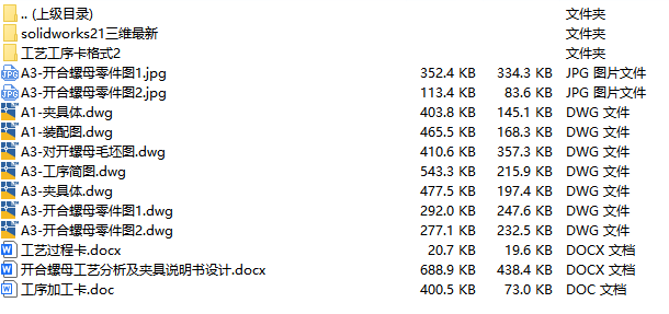 文件内容:solidworks24版三维模型、CAD图纸、工艺卡、工序卡、设计说明书、工序卡用图 solidworks24版本模型源文件,可编辑,含参数 开合螺母夹具solidworks24版三维装配模型 开合螺母夹具solidworks24版三维装配模型 开合螺母夹具CAD装配图 开合螺母CAD零件图 开合螺母CAD夹具体 开合螺母CAD毛坯图 机械加工工艺卡 机械加工工序卡 开合螺母设计说明书目录 开合螺母设计说明书内容