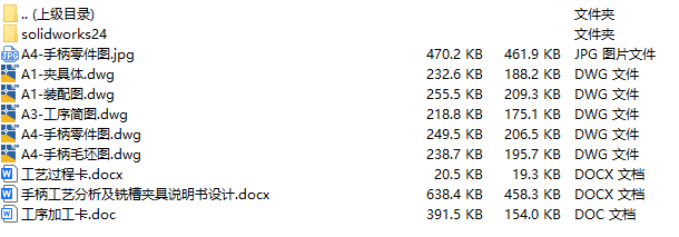 文件内容:solidworks24版三维模型、CAD图纸、工艺卡、工序卡、设计说明书、工序卡用图 solidworks24版本模型源文件,可编辑,含参数 手柄夹具solidworks24版三维装配模型 手柄夹具solidworks24版三维装配模型 手柄夹具CAD装配图 手柄CAD零件图 手柄CAD夹具体 手柄CAD毛坯图 机械加工工艺卡 机械加工工序卡 手柄设计说明书目录 手柄设计说明书内容