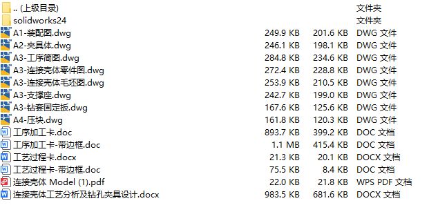 文件内容:solidworks24版三维模型、CAD图纸、工艺卡、工序卡、设计说明书、工序卡用图 solidworks24版本模型源文件,可编辑,含参数 连接壳体夹具solidworks24版三维装配模型 连接壳体夹具solidworks24版三维装配模型 连接壳体夹具CAD装配图 连接壳体CAD夹具体 连接壳体CAD零件图 连接壳体CAD毛坯图 机械加工工艺卡 机械加工工序卡 连接壳体设计说明书目录 连接壳体设计说明书内容