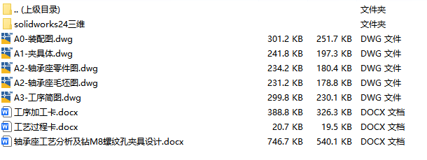 文件内容:solidworks24版三维模型、CAD图纸、工艺卡、工序卡、设计说明书、工序卡用图 solidworks24版本模型源文件,可编辑,含参数 轴承座夹具solidworks24版三维装配模型 轴承座夹具solidworks24版三维装配模型 轴承座夹具CAD装配图 轴承座CAD零件图 轴承座CAD夹具体 轴承座CAD毛坯图 机械加工工艺卡 机械加工工序卡 轴承座设计说明书目录 轴承座设计说明书内容