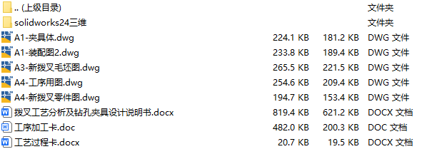 文件内容:solidworks24版三维模型、CAD图纸、工艺卡、工序卡、设计说明书、工序卡用图